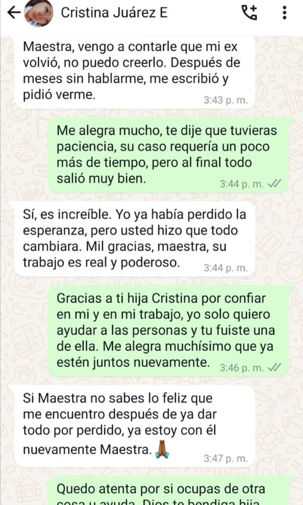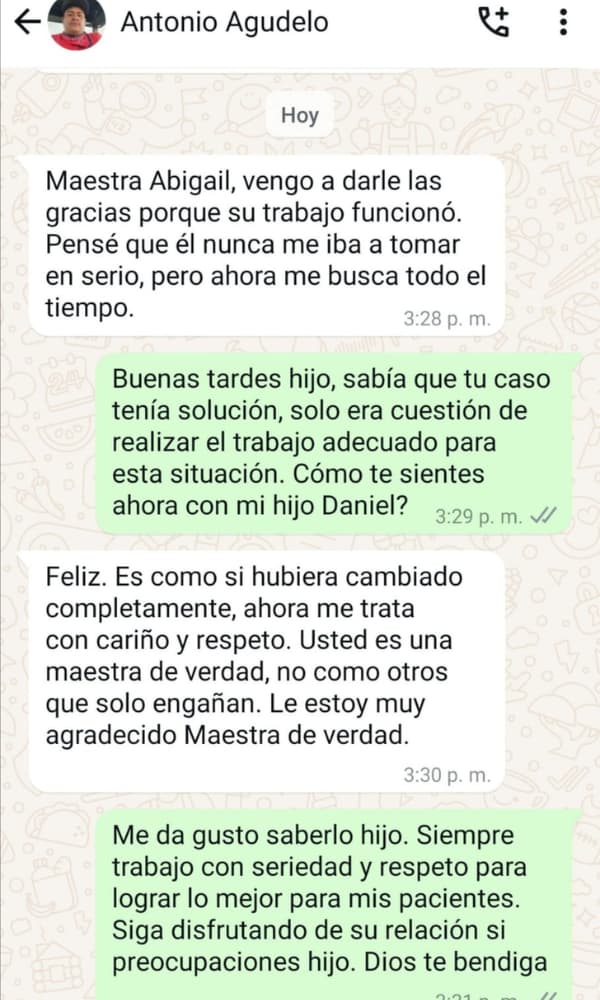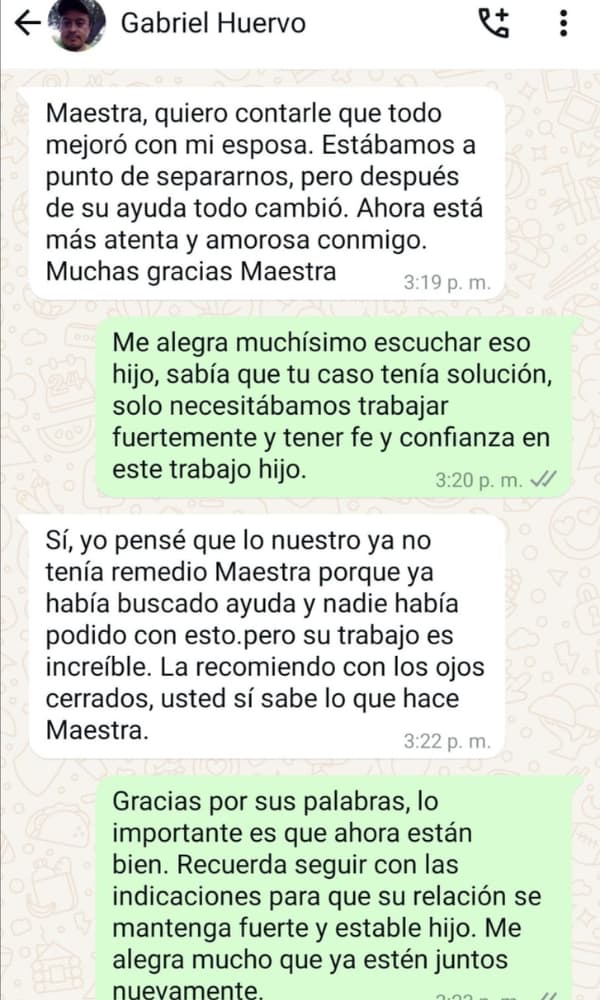CONDICIONES DE USO Y TÉRMINOS: Ningún resultado es garantizado al 100%. Todos los resultados varían según la persona y el seguimiento que se realice. ADVERTENCIA: Este sitio debe ser accedido únicamente por personas mayores de edad. Todos los procedimientos que se realicen a partir de este lugar, son con fines de recreación y entretenimiento de los usuarios. POLÍTICA DE LLAMADAS: Las llamadas o mensajes de texto a cualquiera de los números de contacto, tienen costo y varían de acuerdo al operador de telefonía del usuario. Para mayor información sobre costos, puede consultar con su proveedor de servicio telefónico. El simple uso de este sitio web, no genera al usuario costos. Los costos que se puedan generar por llamadas, mensajes de texto ó uso de aplicaciones como whatsapp, están sujetos a los costos por contratación de plan de servicios de cada usuario con su proveedor de servicio telefónico. POLÍTICA DE REEMBOLSOS: Los resultados de los servicios aquí ofrecidos, varían de una persona a otra, todos los casos son diferentes. El usuario puede contratar cualquiera de los servicios aquí ofrecidos a través del contacto telefónico o mediante correo electrónico. El costo que pueda generar cualquiera de los servicios ofrecidos, es acordado entre las partes y deberán ser pagados a través de: transferencia bancaria. POLÍTICAS DE PRIVACIDAD: El usuario declara que los datos que aquí se solicitan , son entregados de manera voluntaria con el único objetivo de ser usados para consulta. No recolectamos ningún tipo de información personal de tratamiento sensible: religiosa, privada y personal o financiera, el usuario podrá sustituir su nombre por seudónimos si así lo desea. La información que se le proporcione al usuario se hace bajo la autorización del mismo y se emplea con fines de estudio de su caso.